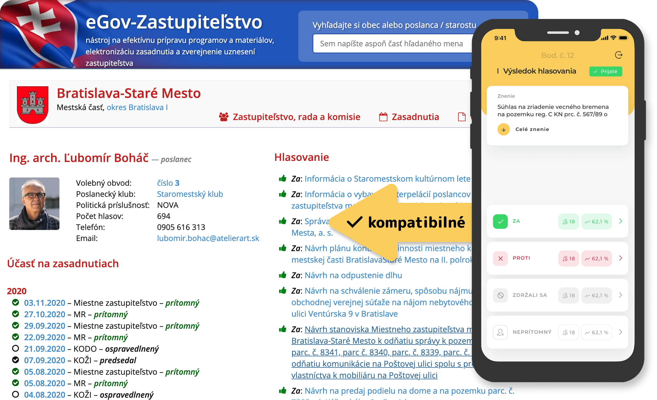 Podľa zákona sú obce povinné zverejňovať informácie o zasadnutiach, materiáloch, uzneseniach a hlasovaniach. SMARTvote vám to uľahčí a vyhnete sa chybám. SMARTvote je plne kompatibilný so systémom samospráv eGov-Zastupiteľstvo. Ak vaša samospráva používa iný elektronický systém na zverejňovanie, SMARTvote vie byť prostredníctvom XML výstupu plne kompatibilný aj s tým.